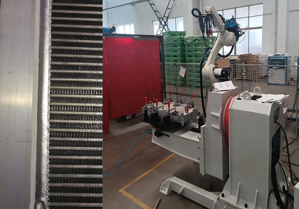 Este proyecto de transformación técnica es de soldadura robotizada, utilizado principalmente para soldadura MIG de productos como intercoolers, enfriadores de aceite y tanques de agua; dos robots de soldadura están equipados con un posicionador cada uno, que pueden completar independientemente la soldadura de piezas de trabajo o dos robots pueden soldar la misma pieza de trabajo del primer posicionador al mismo tiempo, y luego soldar la pieza de trabajo del segundo posicionador después de completar (la segunda pieza de trabajo puede ser igual o diferente en especificaciones de la primera pieza de trabajo). Los dos robots están ubicados en el centro del área de trabajo, con un posicionador colocado en cada lado.